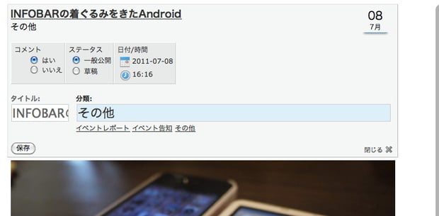 このタイトルの横にある、分類が大事なのです。この分類に、今回のケースであれば料理写真、旅行関連、友人関係というタグをつくり、各記事に分類をつけておきます。